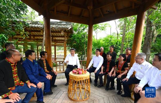 4月10日至13日,中共中央总书记、国家主席、中央军委主席习近平在海南考察。这是11日下午,习近平在五指山市水满乡毛纳村,同黎族村民王柏和一家亲切交谈。新华社记者 谢环驰 摄