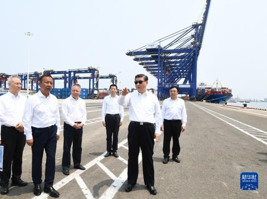 4月10日至13日,中共中央总书记、国家主席、中央军委主席习近平在海南考察。这是12日上午,习近平在洋浦国际集装箱码头小铲滩港区考察。新华社记者 谢环驰 摄