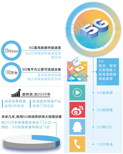 与4G相比,5G可以支持最多192个天线,加上更大的频率带宽、更广的频率范围,带来更高的用户数据传输速率和更大的网络容量,可以满足增强现实、虚拟现实、裸眼3D视频等超高速率业务的传输需求,用智能终端分享3D电影、游戏以及超高清节目的时代已向我们走来。