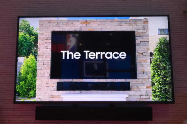 三星首次展出The Terrace户外电视。The Terrace搭载了4K分辨率QLED面板,支持IP55防水防尘,即便将其放置在糟糕的风雨环境下,也不会对设备造成损害,屏幕亮度高达2000尼特,即便在太阳直射的情况下,画面依然能够保持清晰,适合在露天阳台等户外空间使用。